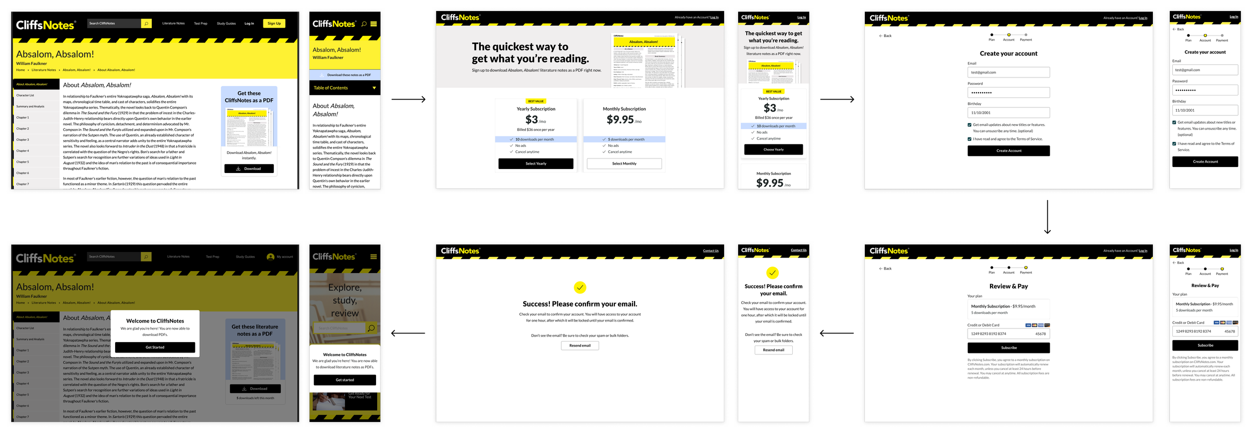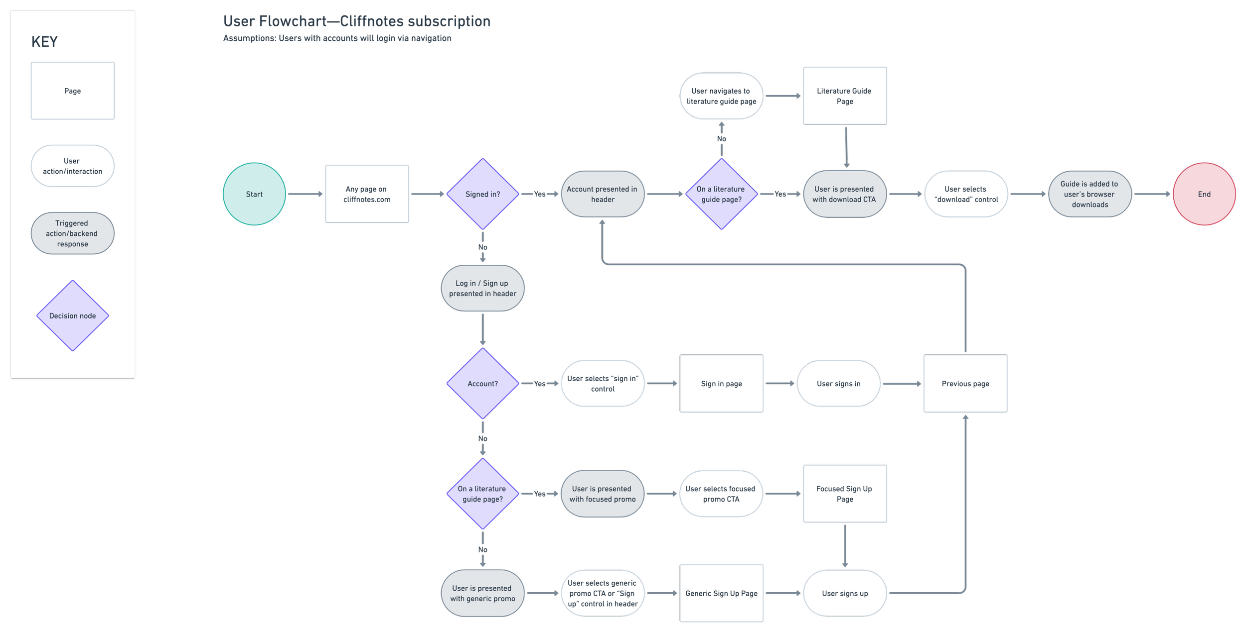 Integrating this design into the current site was the goal of this build. An intuitive usable solution that would communicate clearly to potential subscribers the value of their subscription. We first dove into the hypothesis we were trying to test: would people even subscribe for a CliffsNotes subscription? How can we clearly highlight the value of it? After conversing with stakeholders, we developed the following user flow to capture all use cases: