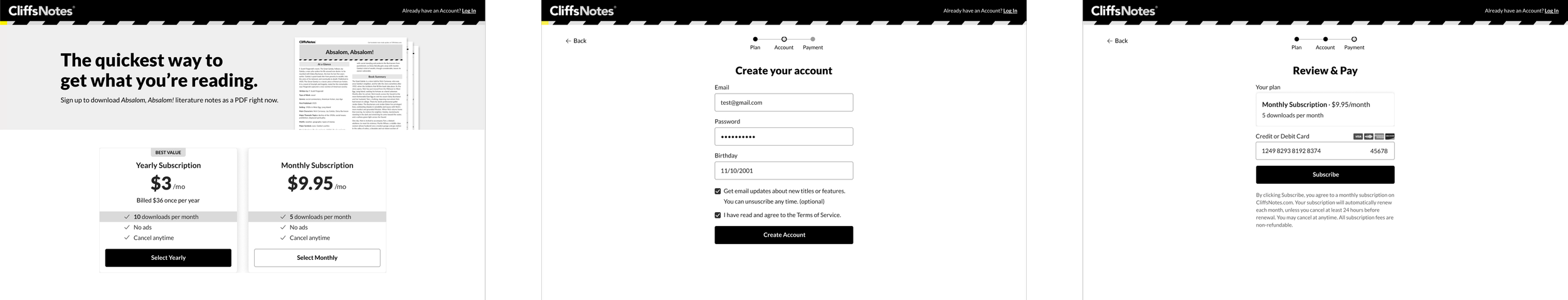 As this was the first subscription on CliffsNotes, we used an existing component library used on another site and translated components to match CliffsNotes UI language. This tactic ended up saving us development time to launch the project quickly.