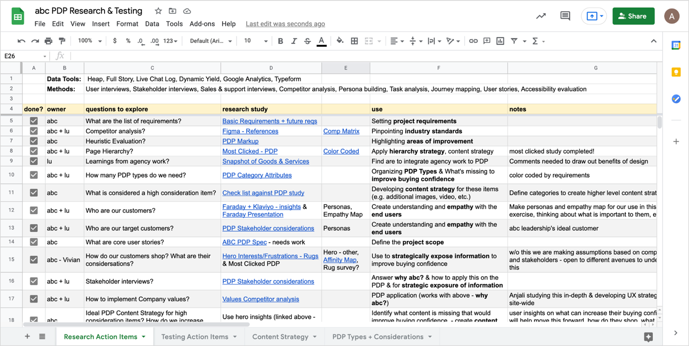 Senior leadership’s goal helped us hone in on preliminary research. Since refining project scope required collaboration cross-team, we needed clear ownership over each research initiative to keep the project efficient and focused. I proactively created a detailed spreadsheet outlining responsibilities and drivers for every research component, ensuring transparency, accountability, and smooth coordination across teams.