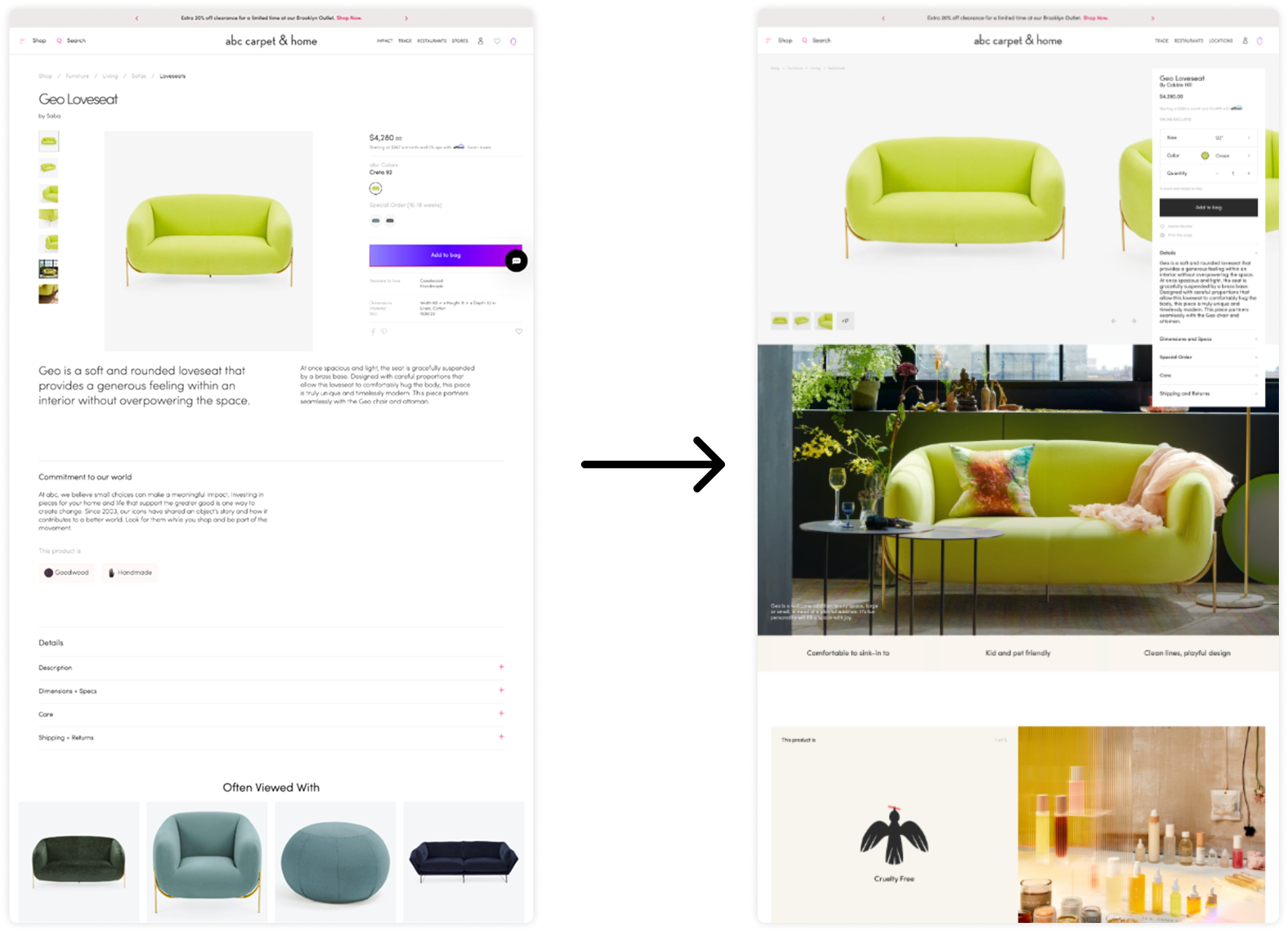 Redesigning the product page was a top priority for leadership at abc carpet & home. Since their products were high‑consideration purchases, users needed more reassurance throughout the buying journey. Our goal was to increase customer confidence and ultimately improve conversion. I served as the Lead Product Designer, partnering closely with the Lead Product Manager and an external agency responsible for the build. Throughout the process, I drove the design vision: collaborating directly with the agency to ensure alignment, feasibility, and fidelity to the intended experience. Beyond the core team, I also worked with the content team and other cross‑functional partners to support a cohesive launch.